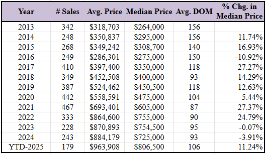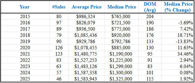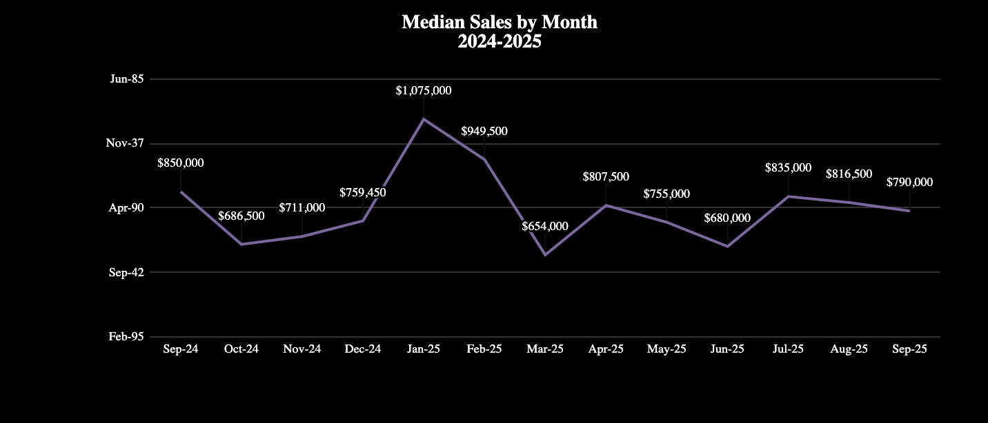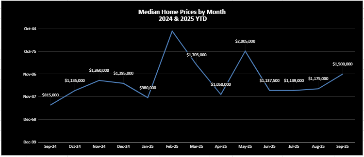 The graph below illustrates monthly fluctuations in median single-family home prices for 2024 and 2025. Throughout 2024, prices generally trended downward. However, February 2025 experienced a significant uptick, primarily due to several high-end sales exceeding $3 million. In September, the median price reached $1,500,000. This figure is based on three transactions, highlighting the impact that limited volume can have on monthly median prices.
