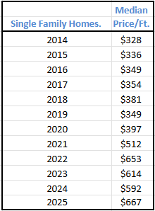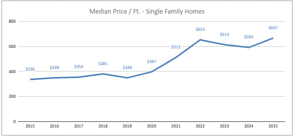 Analyzing the median price per square foot offers valuable insights into long-term market trends. The chart below presents the median price per square foot for single-family homes from 2014 to the present, illustrating how home values have evolved over the past decade.