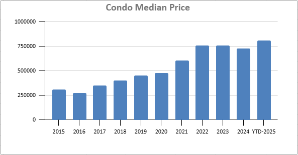 The chart below reflects monthly fluctuations in median condominium sale prices from July 2024 through present. Overall, the data shows a volatile market with a mix of seasonal shifts, low sales volume influence, and one-off high-end transactions.
