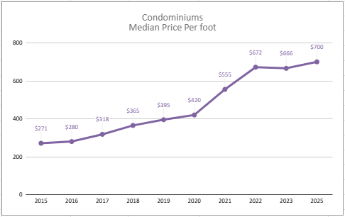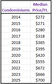 The median price per square foot has increased from 2014 to 2025, with slight dips observed in 2023 and 2024.