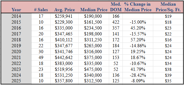 In 2024, the median land price dropped sharply by 28.4% to $340,000, reflecting a significant correction after a strong 2023. However, as of year-to-date 2025, the market shows modest recovery, with a 5.59% increase in the median price to $312,500. Overall pricing remains well below 2023 levels, and price per square foot has decreased. There were 2 land sales in the month of September 2025.