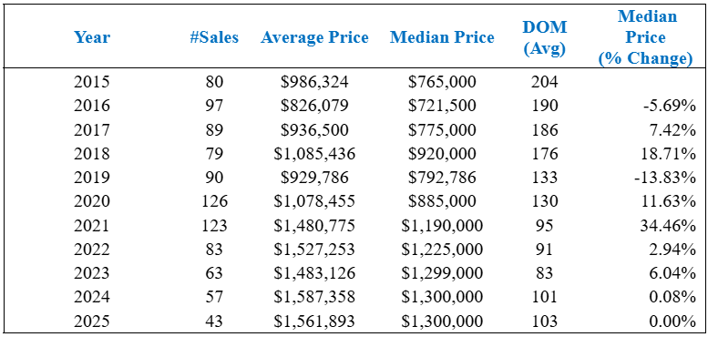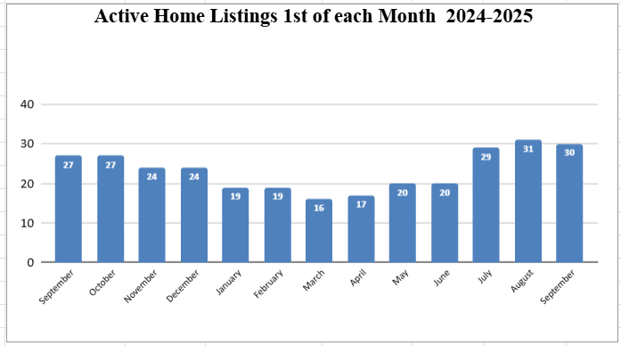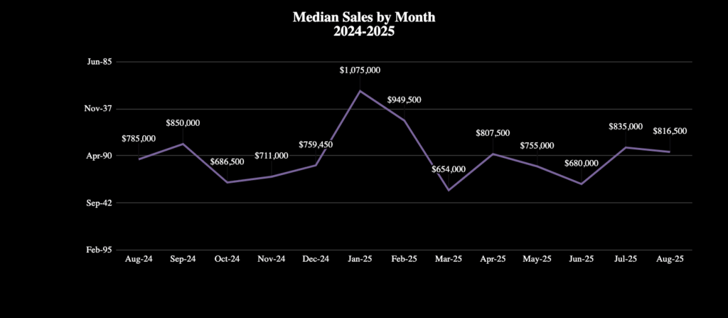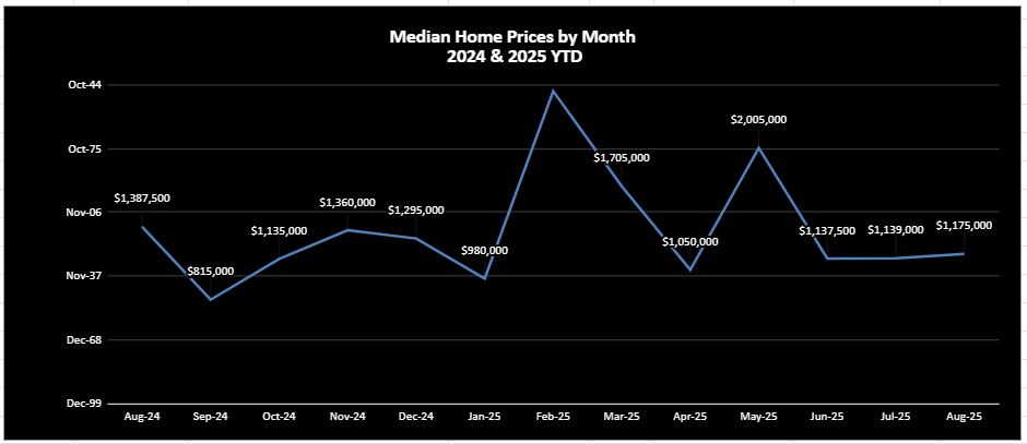 The graph below illustrates monthly fluctuations in median single-family home prices for 2024 and 2025. Throughout 2024, prices generally trended downward. However, February 2025 experienced a significant uptick, primarily due to several high-end sales exceeding $3 million. In August, the median price reached $1,175,000. This figure is based on seven transactions, highlighting the impact that limited volume can have on monthly median prices.