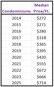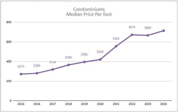 The median price per square foot has increased from 2014 to 2025, with slight dips observed in 2023 and 2024.