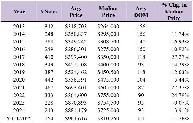 In 2024, the median land price dropped sharply by 28.4% to $340,000, reflecting a significant correction after a strong 2023. However, as of year-to-date 2025, the market shows modest recovery, with a 5.59% increase in the median price to $359,000. Overall pricing remains well below 2023 levels, and price per square foot has decreased. There were NO land sales in the month of August 2025.