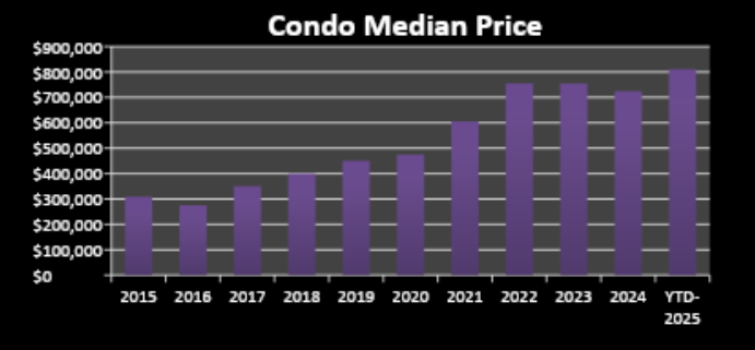 The chart below reflects monthly fluctuations in median condominium sale prices from July 2024 through present. Overall, the data shows a volatile market with a mix of seasonal shifts, low sales volume influence, and one-off high-end transactions.